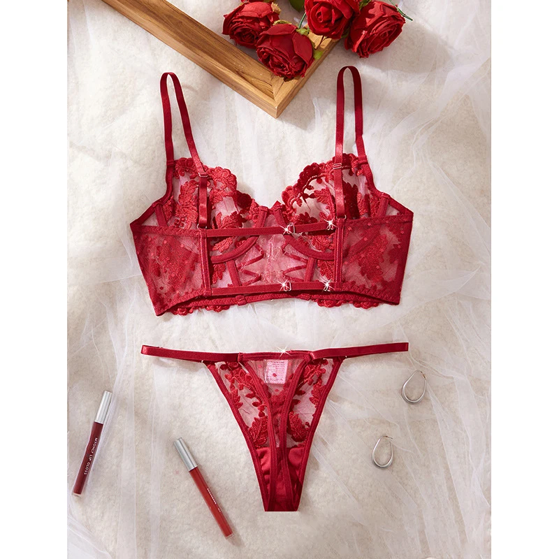 $25.99Wine Red Embroidery Rhinestone Lingerie Set