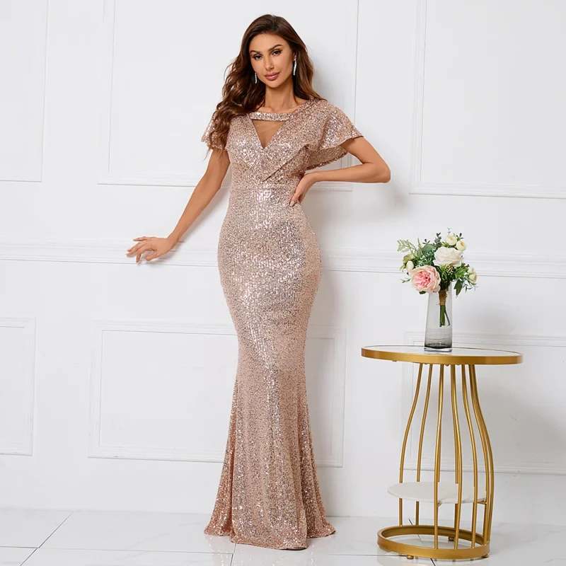 Champagne Slash Neck Sequin Dress