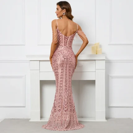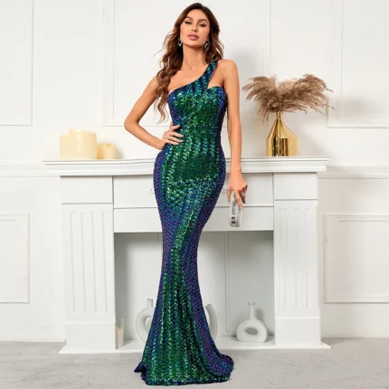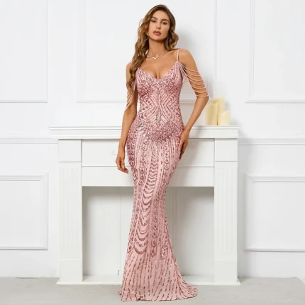 The Women’s Green Sequin V Neck Strap Maxi Dress is a captivating blend of elegance and glamour, perfect for any special occasion. Designed with a shimmering green sequin fabric, this dress radiates with every movement, creating a show-stopping effect under the lights. The V-neckline offers a flattering, elongated look, while the sleeveless design highlights your shoulders and arms for a sleek, modern silhouette. The natural waistline and mermaid cut accentuate your curves, gracefully flowing into a floor-length hem that adds a dramatic, feminine flair. The dress is crafted from high-quality polyester, ensuring both comfort and durability. With its built-in bra for added support, this dress promises a secure fit that allows you to move with ease and confidence. Perfect for prom, evening parties, or gala events, this green sequin dress is an elegant choice for anyone who wants to make a bold and glamorous statement.