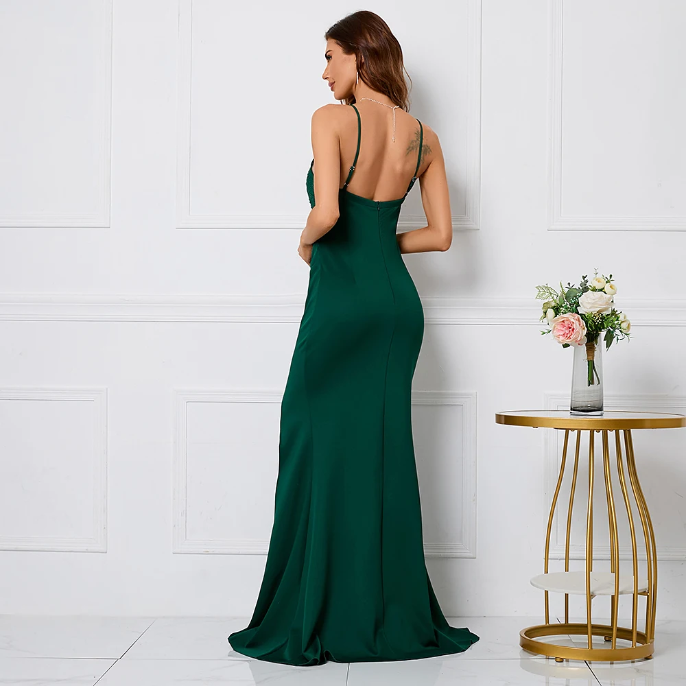 Elevate your evening style with this elegant green satin maxi dress designed for effortless sophistication. Featuring delicate straps, a flattering V-neckline, and sparkling crystal embellishments with ruched detailing, this gown perfectly balances simplicity and glamour. The trumpet/mermaid silhouette with a natural waistline enhances your curves, while the floor-length design and stylish thigh-high slit add graceful movement. Crafted from smooth polyester satin, it offers a soft, luxurious feel for long events. The sleeveless design and built-in bra provide comfort and support, making this dress a perfect choice for prom nights, weddings, formal parties, and special celebrations.
