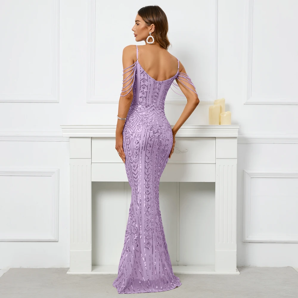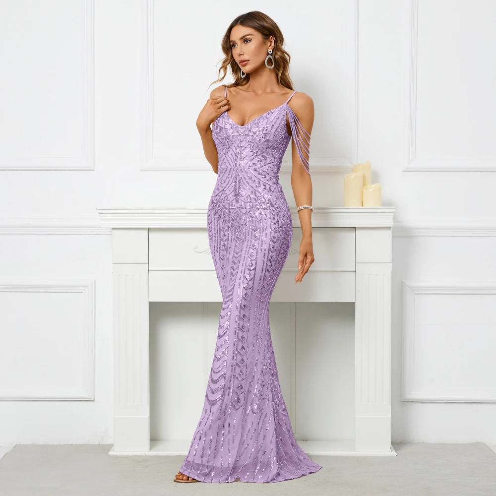 Shine effortlessly in this glamorous purple sequin maxi dress designed to turn heads at every special occasion. Featuring elegant spaghetti straps, a flattering V-neckline, and intricate beading with all-over sequins, this dress radiates sparkle and sophistication. The trumpet/mermaid silhouette with a natural waistline beautifully contours your figure, while the floor-length design adds timeless elegance. Crafted from high-quality polyester sequin fabric, it offers a dazzling finish with comfortable wear. The sleeveless style and built-in bra provide support and confidence, making this gown a perfect choice for parties, prom nights, weddings, evening events, and red-carpet-inspired moments.